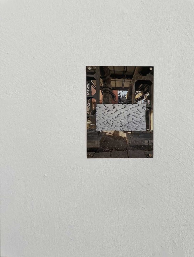 Die Fotografie dokumentiert die temporäre Hängung am Ort der Entstehung der Arbeit in der Handwerkergasse der Völklinger Hütte am 15.12.2025