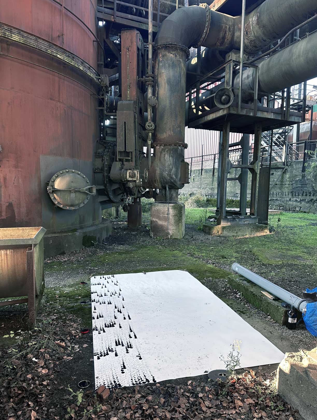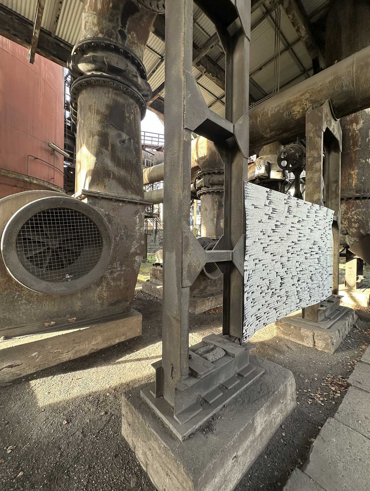 Die Fotografie dokumentiert die temporäre Hängung am Ort der Entstehung der Arbeit in der Handwerkergasse der Völklinger Hütte am 15.12.2025